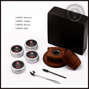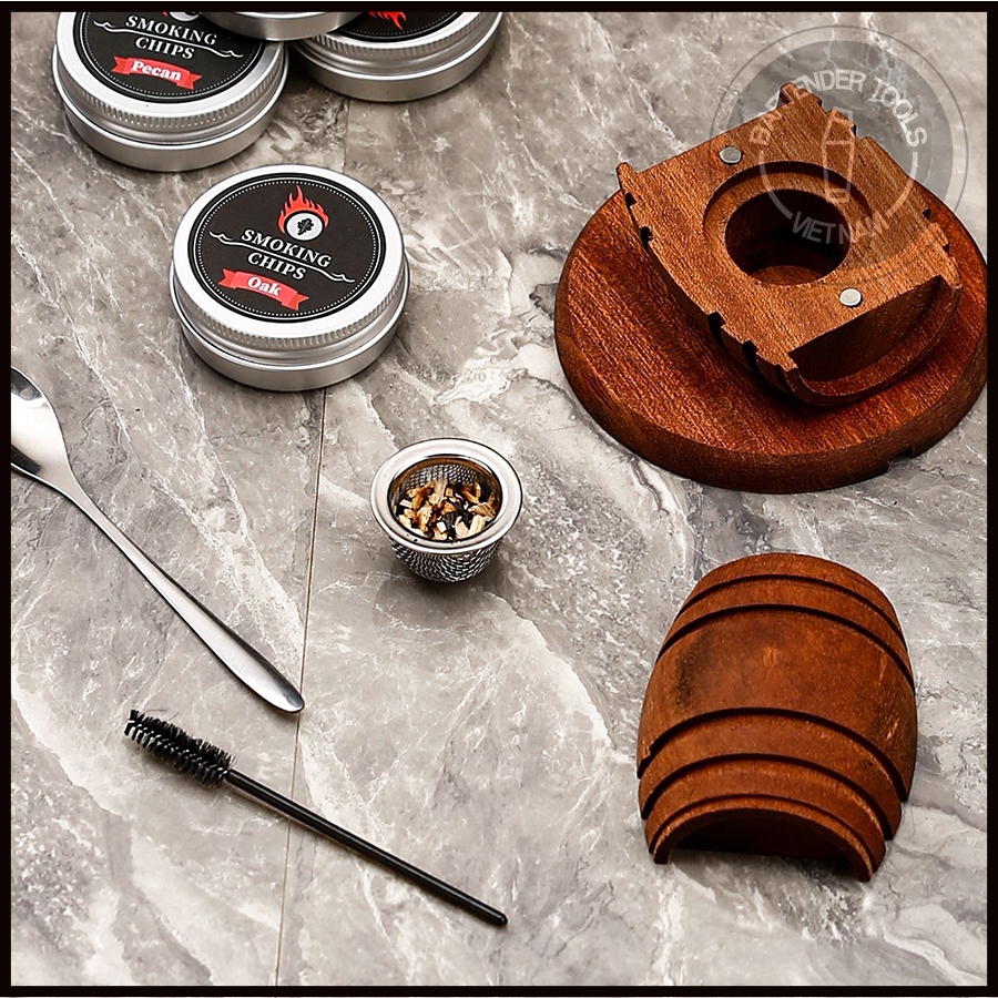 Bộ dụng cụ gồm 1 dụng cụ tạo khói , 4 hộp mùn cưa 4 vị khác khau bao gồm : gỗ anh đào, gỗ táo, gỗ hồ đào và gỗ sồi. 100% gỗ tự nhiên ướp hương vị